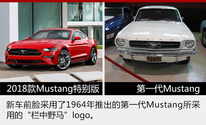 新款福特Mustang Pony Badge车型前脸采用了第一代Mustang的设计,进气格栅增加了一条铬合金横向装饰条,logo为“栏中野马”样式。在此之前,这一设计最后一次出现在2015款车型上,作为一款50周年限量车型套件。