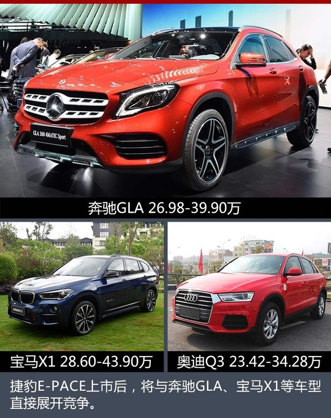 捷豹E-PACE推出后,竞争对手将锁定在目前中国市场较受欢迎的奔驰GLA、宝马X1以及奥迪Q3等同级别豪华紧凑型SUV车型上。参考捷豹另一款重磅车型XFL,上市时公布的起售价就低于BBA的同级别竞品车型。捷豹E-PACE未来国产后,起售价预计会低于28万。(图/文 网通社 刘楠)