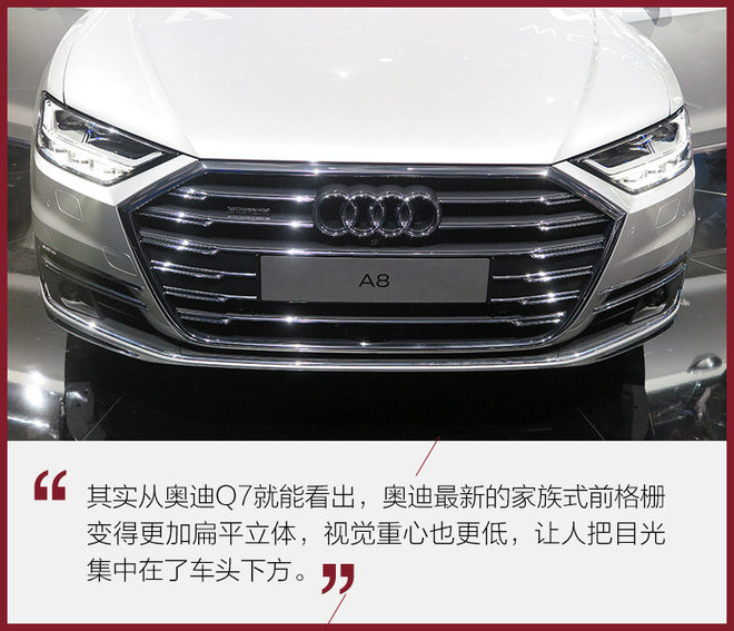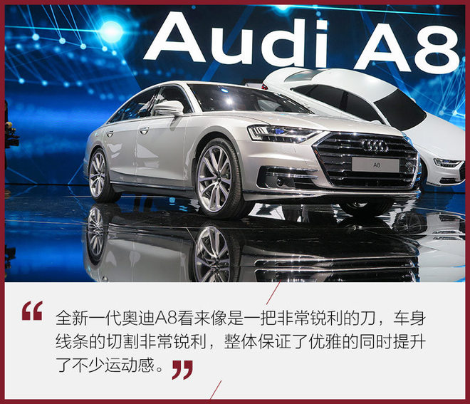 每年9月份的苹果发布会,是不少年轻人最值得期待的日子,不管之前网上曝光的无边框、自带投影还是无线充电技术,都能让大部分科技粉翘首以待。可是每当产品正式发布后之前的猜测都被一个个打消,不禁让人有些失望。而在汽车界以前沿科技和数字化为傲的奥迪A8 (配置|询价),同样拥有让人期待的本事,但在这次换代前它的信息曝光却非常少,仅在正式发布的前几天才公布了几张宣传照片,让我们这些奥迪粉满是着迷,作为奥迪将来要展现未来最新理念的旗舰车型,如今它终于在西班牙巴塞罗揭开了神秘面纱。