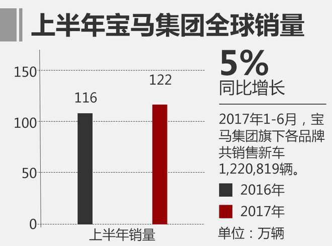 2017年,宝马在全球市场推出全新一代5系等多款车型,使得在全球范围内销量一涨再涨。网通社从宝马集团官方获悉,今年上半年宝马在全球范围内共销售新车1,220,819辆,同比去年增长5%。中国市场销量接近30万辆,占全球市场总销量的比重将近25%。