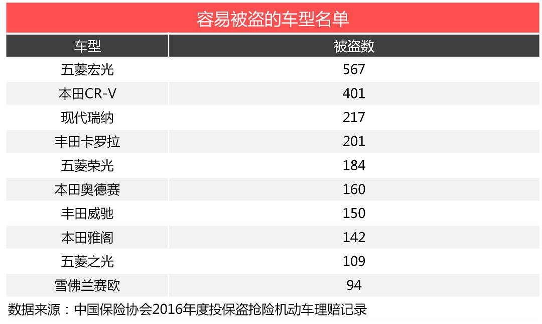 以下是这两年较容易被盗的车型