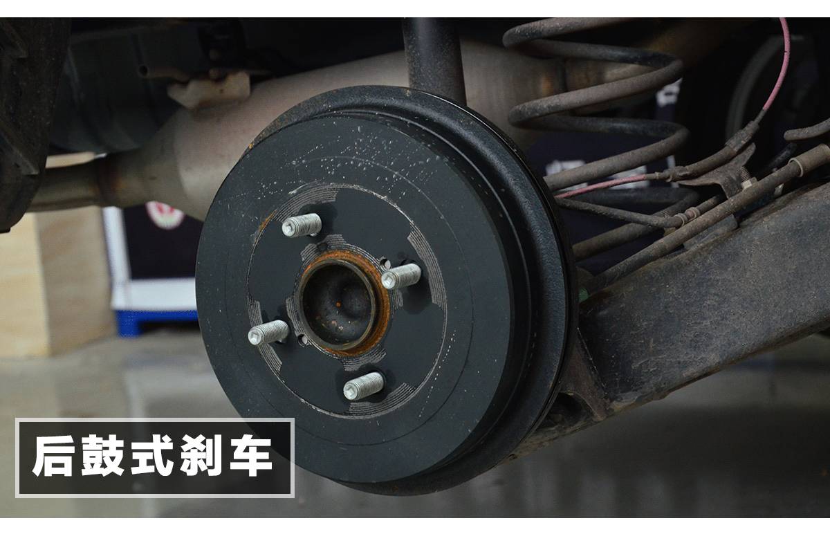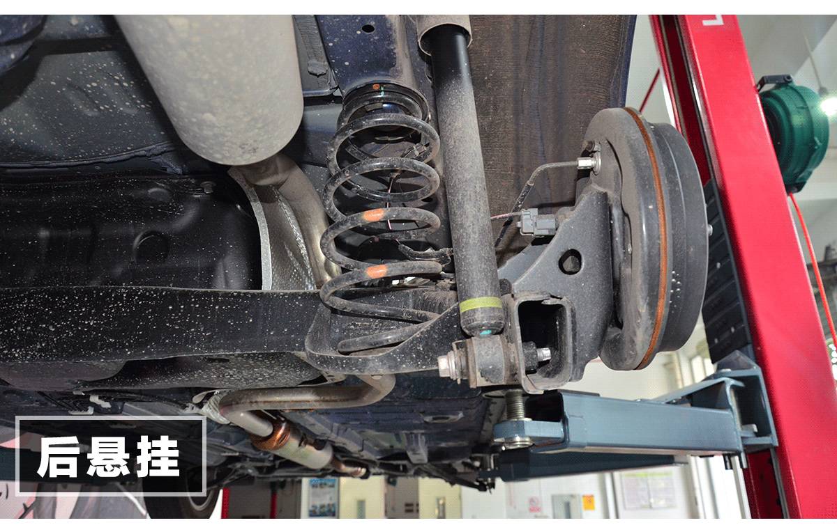 后悬挂的扭力梁结构很简单,冲压钢板的横梁还算厚实,弹簧和避震器采用分离设计,弹簧和避震器可伸缩幅度也不大,这使得后悬挂的滤震比较生硬。当然,同级的合资轿车,也大多如此。