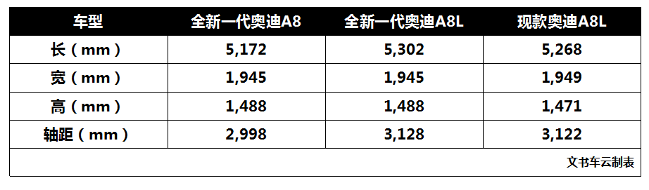 此外,全新一代奥迪A8车身尺寸比现款略微增加,标准轴距版轴距2998mm,A8L长轴距版轴距增加130mm,达到3128mm。