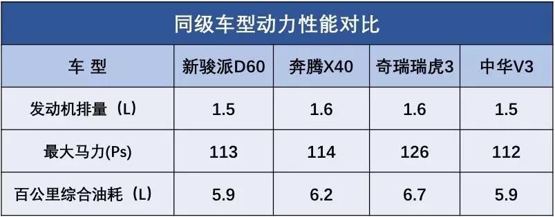 通过上图的动力对比可以看到,搭载1.6L排量发动机的奇瑞瑞虎3最大马力126Ps,确实更为优秀些,当然,这主要还是归功于其更大的排量优势。但是,反观来看新骏派D60,虽然只是1.5L排量,但是最大马力却有113Ps,不仅在动力参数比同为1.5L排量的中华V3更强,并且与1.6L的奔腾X40也是相差无几。更难能可贵的是,在保证强劲动力的同时,新骏派D60的燃油经济性同样更为出色,百公里综合油耗仅为5.9L。