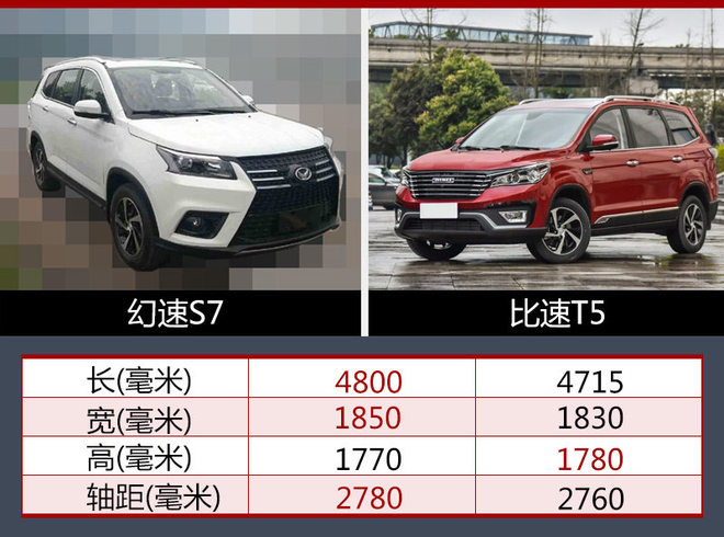 根据数据显示,幻速S7长宽高分别达到4800*1850*1770毫米,轴距为2780毫米。与同级车型比速T5相比,新车在长度、宽度以及轴距数据上超越竞品。