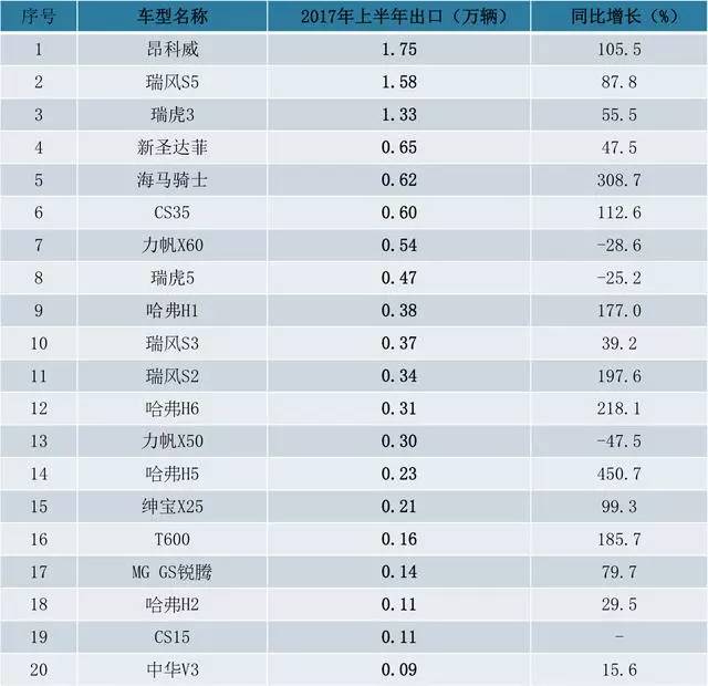 除了上述产品,上半年,出口量超过1000辆的还有瑞风S2、哈弗H6 (配置|询价)、力帆X50、哈弗H5 (配置|询价)、绅宝X25、众泰T600、MG锐腾、哈弗H2、长安CS15。