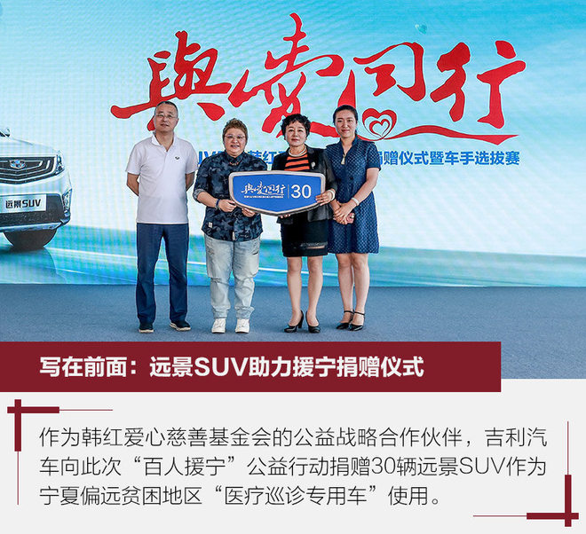 五年来,吉利SUV陪同韩红爱心百人援助团队在西部五省、自治区59个市县累计行驶里程超40万公里。这一次远景SUV即将再次与其携手,把爱与希望带去宁夏,传递给当地需要帮助的人,然而它能否再一次禁住考验?先通过场地测试感受一下。