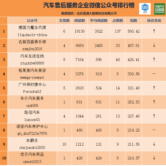 我们搜集了331家汽车售后服务企业、187家汽车用品企业以及101家汽车金融企业等维修、租赁、改装企业的微信公众号,每周二发布汽车后市场企业微信排行榜。