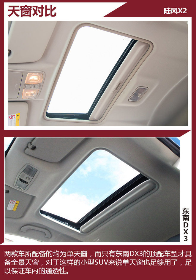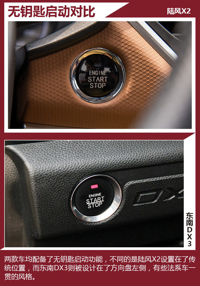 两款对比车型上,我们选择了各自关注度最高以及价格最相近的版本,分别是陆风X2 2017款 1.6L 手动铂锐版(厂家指导价7.88万元)和东南DX3 2016款 1.5L 手动尊贵型(厂家指导价7.79万元),差价为0.9万元,属于同一价格区间。