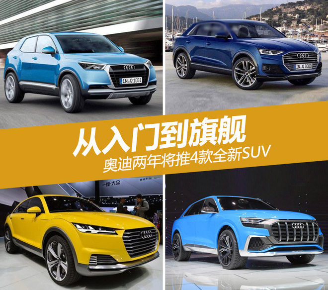 今年上半年奥迪品牌在全球范围共销售新车908,950辆,相比去年同期销量出现微降。奥迪曾多次公布在未来两年內将有10余款新车陆续推出。网通社梳理后发现,奥迪在未来两年里(2018年-2019年)将推出4款SUV,其中包括一款全新换代的奥迪Q3 (配置|询价),以及从入门级至旗舰型全部覆盖的三款新增SUV,分别为Q1、Q4、Q8。