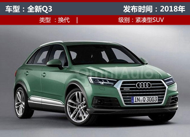 此前海外曝光过全新一代Q3的假想图,新车将采用全新Q5的设计语言,车身线条更加挺拔有棱角,前进气格栅尺寸进一步增大。另外,全新奥迪Q3将基于大众MQB平台设计开发,并使用轻量化技术,尺寸方面也将有所增加。据悉,新车将于2018年正式亮相。