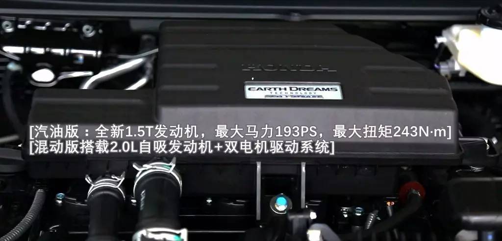 汽油版均搭载全新的1.5T+6MT/CVT动力系统,这是CR-V历史上首次用上涡轮发动机,这套动力系统还用在本田UR-V,冠道等车型上,最大功率为142kW(193PS)/5600rpm,最大扭矩为243N·m/2000-5000rpm,动力输出超过奇骏和RAV4的2.5L的动力;