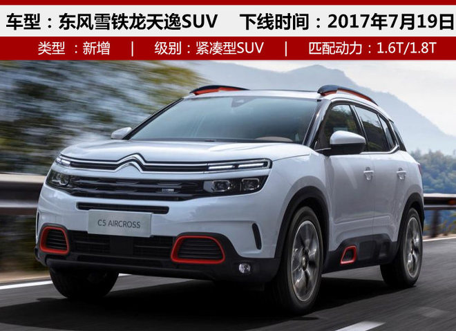 天逸SUV(C5 AIRCROSS)是东风雪铁龙旗下的一款紧凑型SUV, 新车继承AIRCROSS概念车的整体设计风格,并在7月19日正式下线。外观设计上采用最新“飞翼式”前脸,头灯组采用Air wing天翼灯组设计,分别由天翼LED日行灯、天翼立体矩阵式LED大灯组成,与进气格栅融为一体。全新潮流配色和Air bumps越野套件、大量撞色设计等,突显出天逸的“独特”外观。