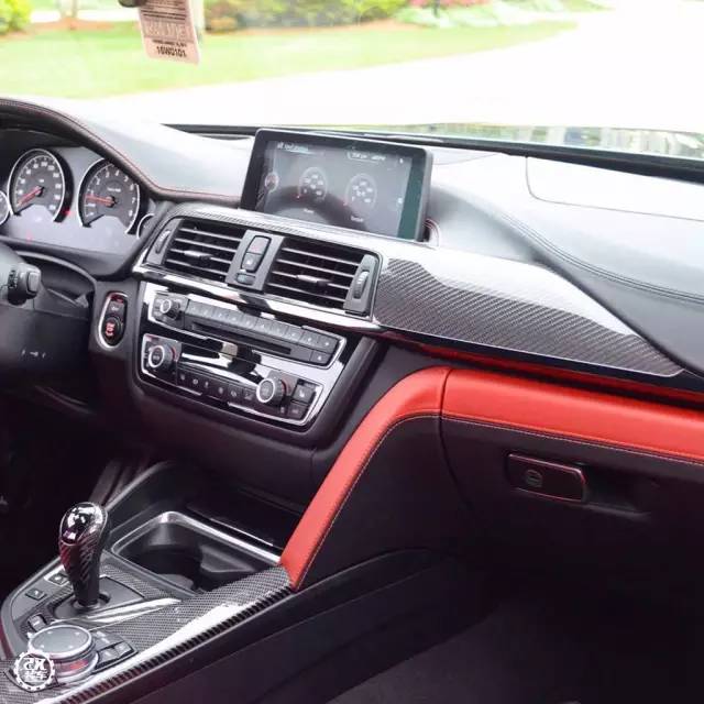 这辆M4在车头加装了一块碳纤维头唇,让车头看起来多了一丝层次感。亮黑的中网左侧加上了M部门同色的三色条,前大灯换上了定制的天使眼,红白交换的LED灯条就像被"辣眼睛"一样,另外在两侧进气口处也加入了红色的线条作为点缀。