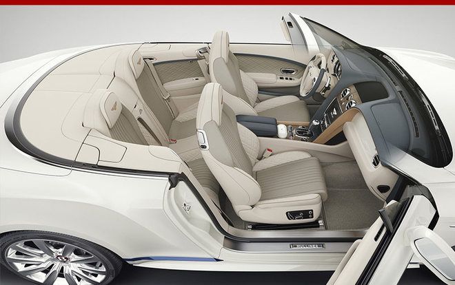 欧陆GT敞篷特别版车型采用了专属的Glacier White配色,车身周围加装了蓝色装饰条,采用21英寸轮圈,并进行了抛光处理。新车采用白蓝相间的车身颜色、豪华的车内氛围与游艇的设计和材质,成功的将海洋生活元和豪华敞篷车的元素结合到一起。