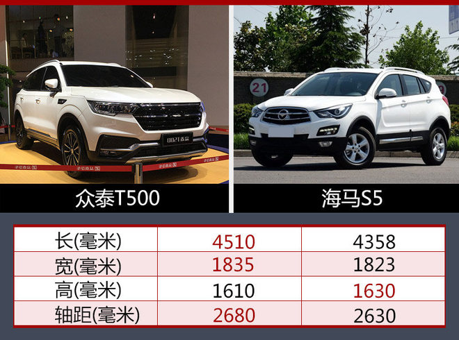 众泰T500长宽高分别为4510*1835*1610毫米,轴距达到2680毫米。海马S5与T500同处紧凑级SUV细分市场,T500除了在高度方面略低于S5外,长度、宽度和轴距均超过竞品车型。