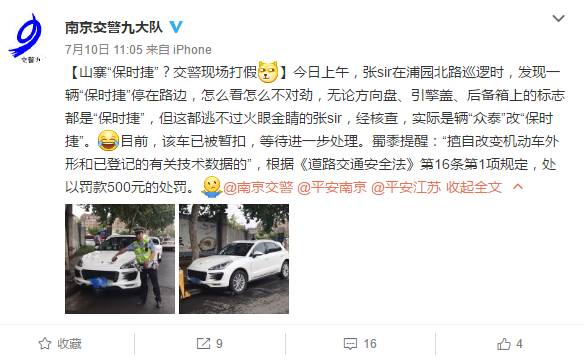 不过呢,装X总会付出代价的!就在这个月初,南京交警就在执勤的时候发现了一辆"保时泰",为了保护萌懂的妹子,也为了捍卫法律,所以交警叔叔给予驾驶员罚款和扣分的处理。