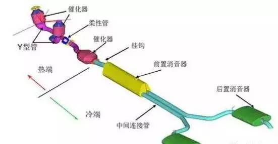 图是汽车排气系统的分解图,最前端是催化器,现在每台车都要有的东西,在催化器之前接着的,就是车子的排气歧管,发动机的废气从气缸里出来,首先就要经过排气歧管。留意中间那个大大的黄色物体,那个叫前置消音器,位置大概在车子中间的地方,它的工作就是进行第一次消音,在第一次消音完成之后,废气会再进入后置消音器进一步消音,最终排出大气。