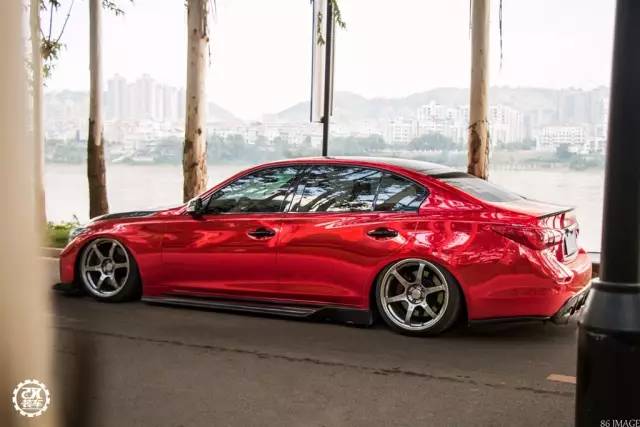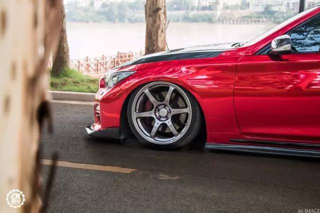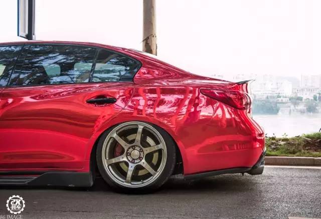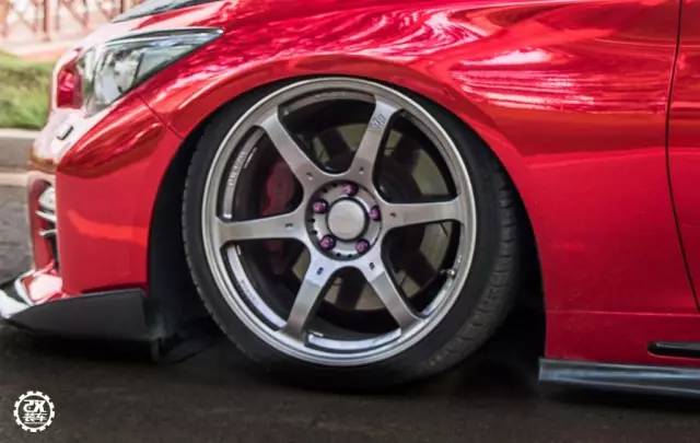 造型简单的RAYS VRG2轮毂非常耐看,同时还升级了英菲尼迪前4后2活塞的刹车套件,虽然看起来很运动,但琪琪却选择用空气避震将车身降低,玩起了姿态风格。