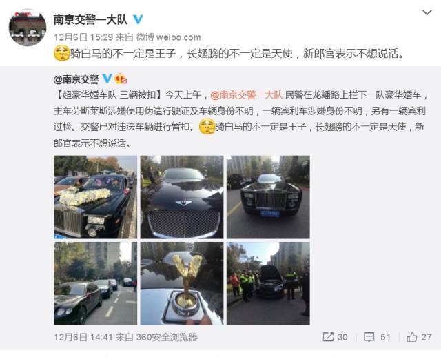 所以,有些婚庆公司就会打起这种主意。有些新人为了在结婚时搞点大排场,所以会请婚庆公司找几辆豪车过来捧场。但是去年南京交警却突查了一个婚车队,没想到里面的车子都是套牌的走私车。