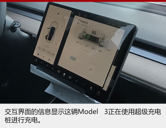 新车交互界面的信息显示这辆Model 3正在使用超级充电桩进行充电,充电速度为272公里/小时,多项数据揭示了新车的剩余充电时间为50分钟,剩余续航里程为144公里,这意味着,充满电后新车的续航里程将达到421公里。特斯拉曾透露首批交付车型将仅提供后驱系统,预定了搭载双电机动力系统的四驱车型的车主则需要等待更长的时间。