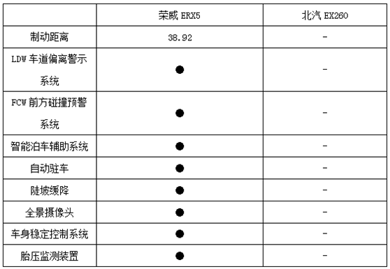 最后,我们再来看下两车在安全上的配置,因为无论是传统燃油车,还是新能源汽车,安全性始终是消费者关注的重中之重。在安全上配置上荣威ERX5搭载了LDW车道偏离警示、FCW前方碰撞预警、智能泊车辅助、自动驻车等主动安全配置。在被动安全方面,例如前排双气囊、前后排头部气囊、胎压监测、车身稳定等配置均有配备。而北汽EX260乐酷版连胎压监测、车身稳定系统配置都没有,甚至还比不上10万级燃油车的水准。相比来看,荣威ERX5在安全上更是展现出了碾压的实力。