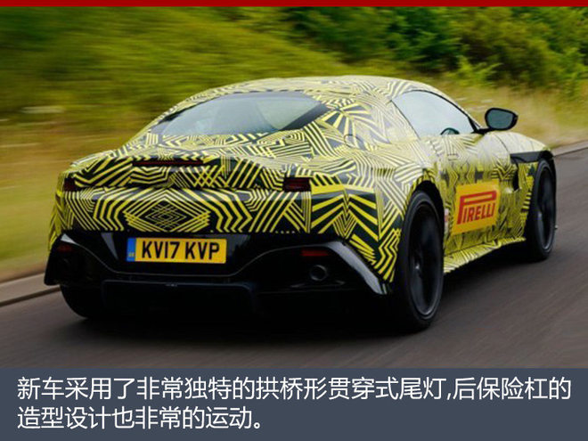 车尾部分,新车尾部被伪装所遮盖,具体细节无法看清。但从整体轮廓来看,全新Vantage应该采用了非常独特的拱桥形贯穿式尾灯,后保险杠的造型看上去也非常运动。下方的保险杠处则配备了形如羽翼展开的扩散器及排气护罩,与之搭配的依然是双边共两出式排气系统。