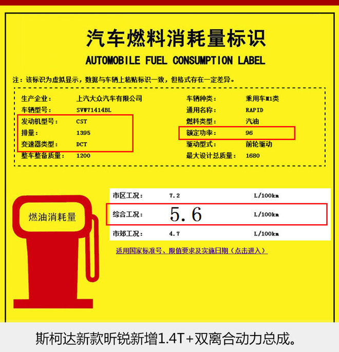 从国家工信部公布的信息可知,斯柯达新款昕锐将新增一台1.4T发动机并匹配双离合变速箱。其中,1.4T发动机额定功率为96千瓦,相比现款在售车型上搭载1.4升自然吸气发动机匹配5速手动变速箱的车型来讲,百公里综合工况下的油耗由原来的5.9升下降至5.6升。