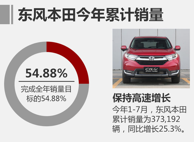 由于上半年的出色表现,东风本田将销量目标从年初制定的65万辆提升至68万辆。2017年7月,东风本田终端销量近6万辆,较去年同期增长18.2%。今年1-7月企业终端累计销量已达373,192辆,较去年同期增长25.3%。从销量目标完成情况来看,东风本田今年1-7月已经完成上调后目标的54.88%。