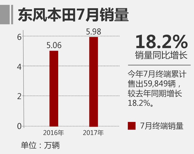 2017年以来,东风本田在销量上保持高速稳定增长,今年1-6月累计销量同比增幅达26.8%,为年中的“期中考”交出了一份满意的答卷。而在7月,企业继续保持此前的稳定增速。网通社从东风本田官方获悉,企业今年7月终端销量为59,849辆,较去年同期的50,638辆增长了18.2%。已完成全年销量目标的54.88%。