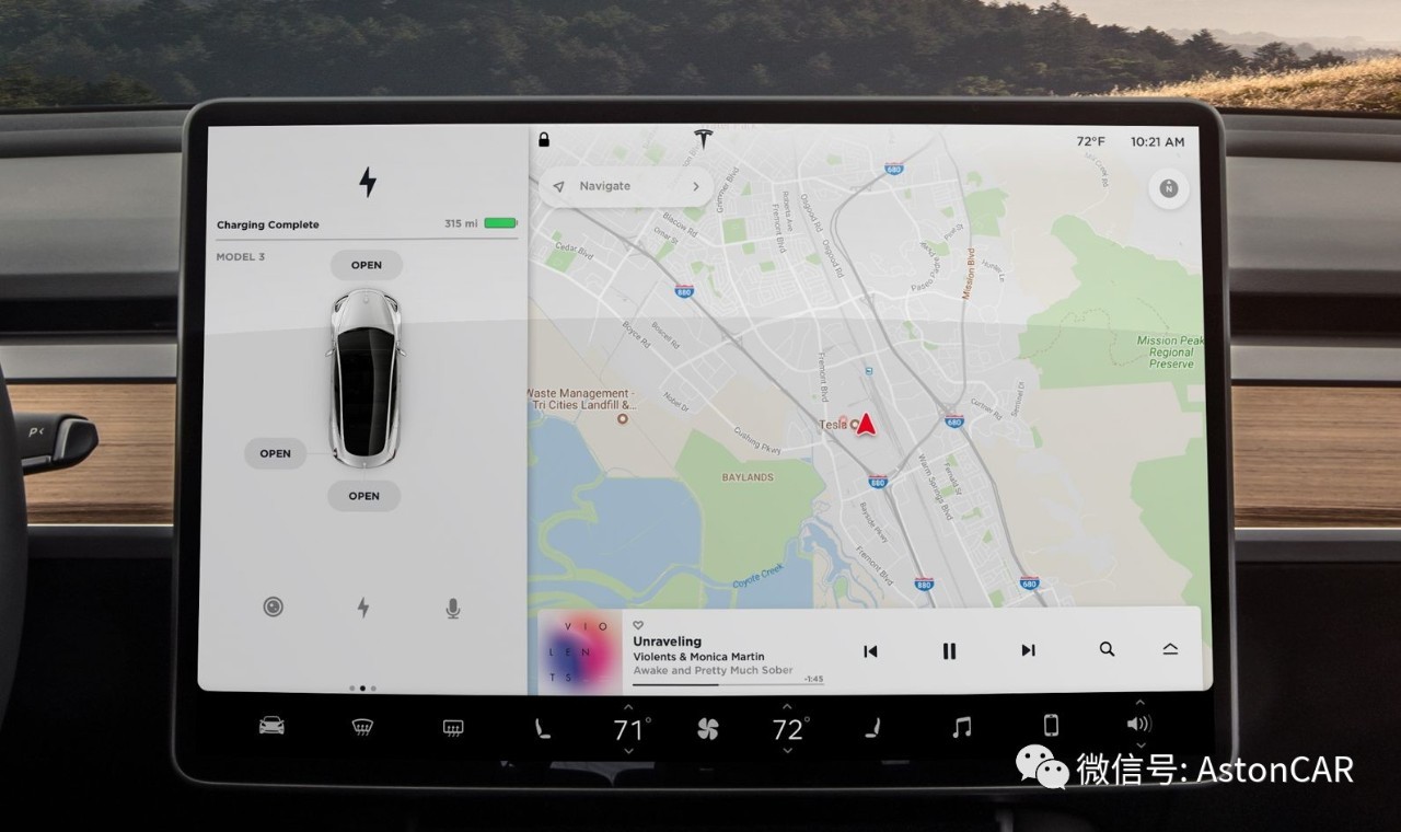 如今,之前的所有预测都被狠狠打脸。量产版的Model 3既无仪表盘和抬头显示仪,也省略了一大堆实体按键,用户通过中控台一块15英寸的屏幕来完成绝大多数操作。相对于S/X的17寸,Model 3的屏幕尺寸虽然小了一点,但由之前纵向改为横向,视觉上显示面积更大了。此外,中控屏分为左右设计,左侧显示车速、档位、音响等重要操作,右侧则留给了次重要的导航和其它设置。