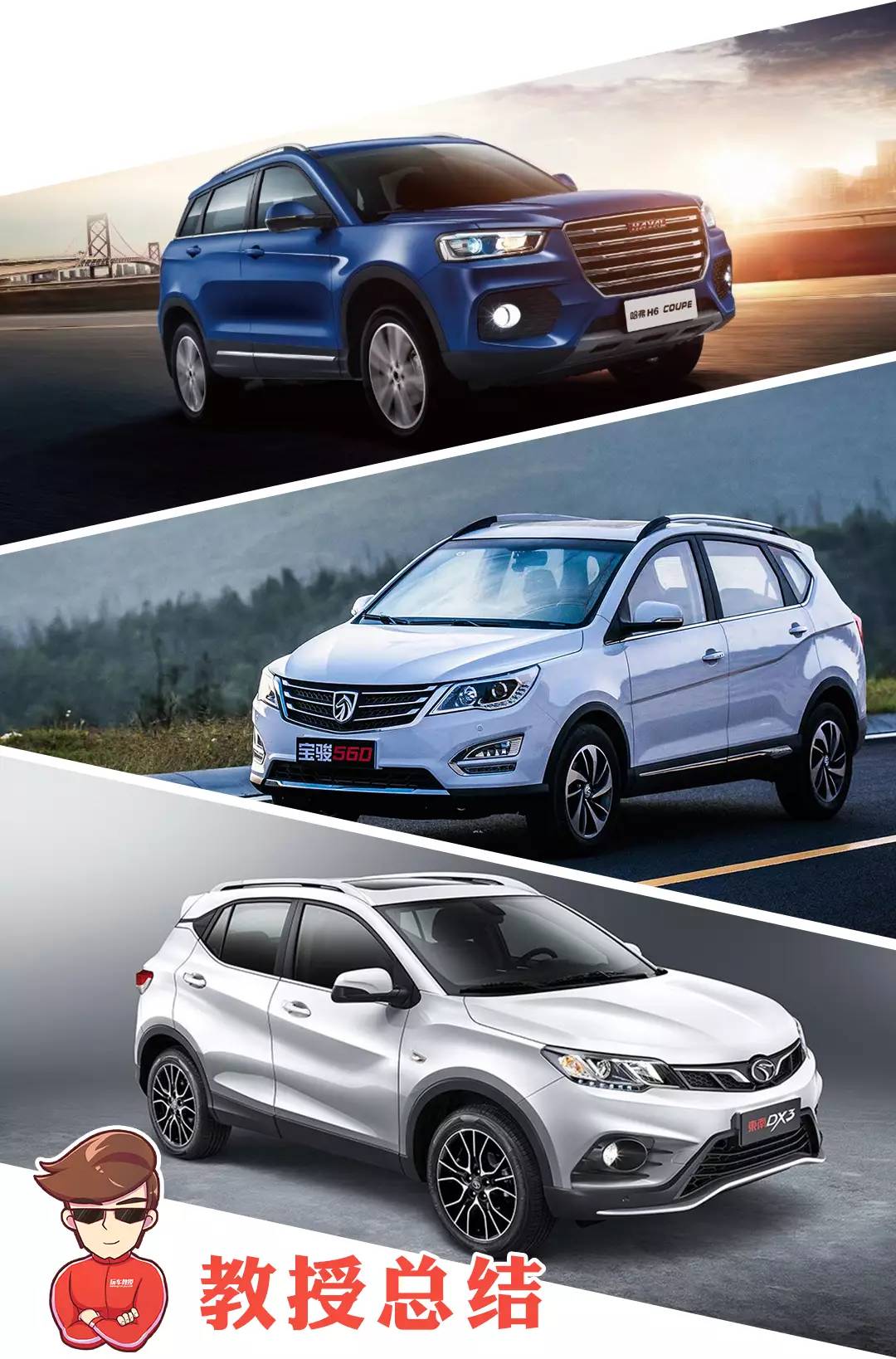 东南DX3造型年轻、运动,配置够用,价格也不高,比较适合年轻人;宝骏560和哈弗H6 coupe就更适合家用,空间大,配置多,但是因为两者价格相差较大,对应的收入人群也有所不同,至于选哪一辆就得看你预算了。