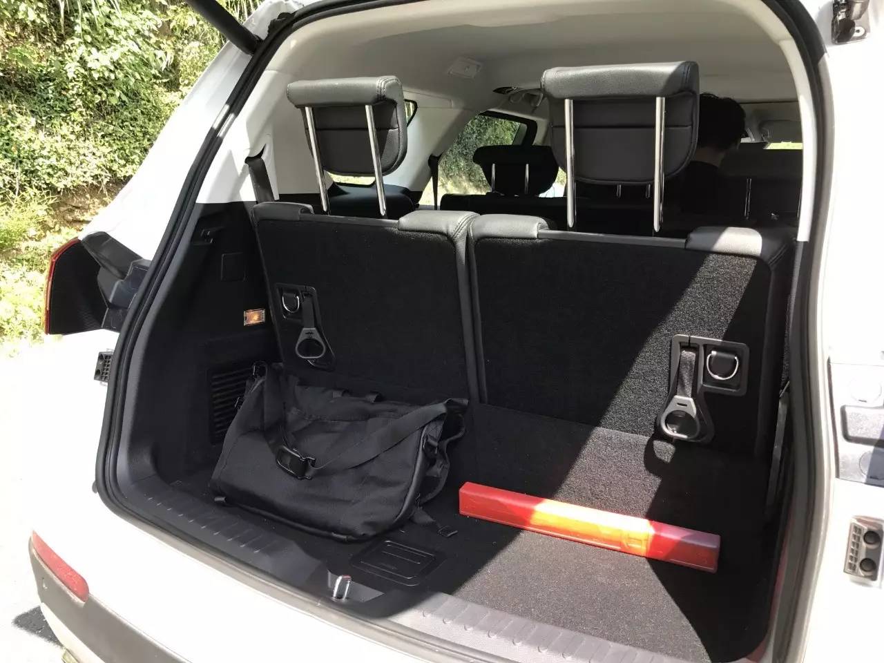 ▲第二排座椅最前和最后位置的对比但是第三排座椅有个问题,就是坐垫短而且座椅高度比较低,所以成年人坐进去会有些压抑的感觉。另外,由于H7L是在H7的基础之上对车尾进行加长,轴距没有变化,所以两车的第二排乘坐空间是一致的,坐在第二排可以轻松翘个二郎腿。而当展开第三排座椅后,后备箱的空间可以放一车人的随身背包等行李,20寸的登机箱差不多可以并排放两个。好在第三排座椅支持5/5分割放倒,如果第三排只坐一位乘客的话,可以将一半的座椅放倒来拓展行李空间。