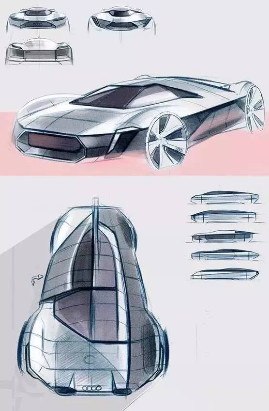 这也是狂开脑洞的阶段。每天要做的就是清空你的脑袋,不停的画草图。我在这个阶段同时展开了四个设计方向,画了6本草图,没错,这就是Pforzheim的教育精髓之一,因为你会在这个阶段积累意想不到的好主意。 奥迪的导师每周会帮我归纳总结,帮助我发散思维,寻找适合奥迪品牌的方向。