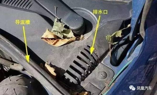 位于发动机舱和挡风玻璃之间的发动机舱排水孔,如果经常有树叶树枝掉在这个地方,就容易造成这排黑色格栅上的排水孔堵塞。