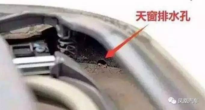 如果这些排水孔被堵塞,就会导致积水沿着车顶流向车内的天窗电机,这样的话就很容易造成天窗电路短路甚至烧毁。