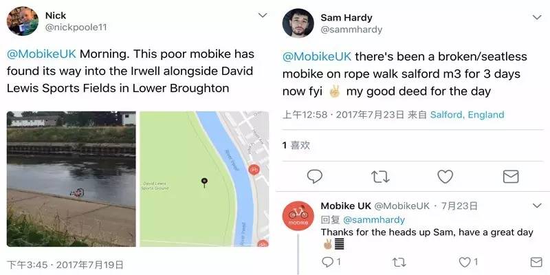 和国内一样,摩拜鼓励用户对被损毁车辆、随意停放进行举报,推特刷了一圈看下来,就几个字:随手举报,不谢!对于这种不需要耗费政(na)府(shui)的(ren)资金的共享单车,腐国人民用行动表示了自己的极大欢迎。