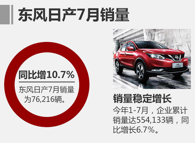 伴随着“YOUNG NISSAN 3.0”时代的来临,东风日产进入了全新发展阶段。2017年1-6月企业终端销量477,917辆(含进口车),同比增长6.1%。进入7月,企业继续保持稳定增长。网通社从日产(中国)获悉,东风日产今年7月销量为76,216辆(含进口车),同比增长10.7%。