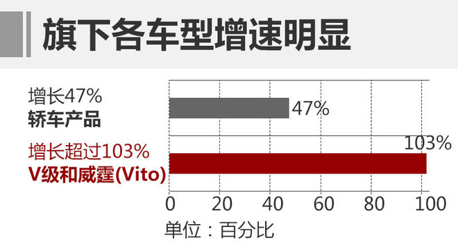 旗下各细分车型,轿车产品在各个细分市场都保持了良好的市场表现,整体实现了47%的增长;SUV产品延续了优异的市场表现;唯一源自豪华汽车品牌的MPV产品V级车和威霆(Vito)持续受到客户认可,1-7月销量同比增长超过103%。