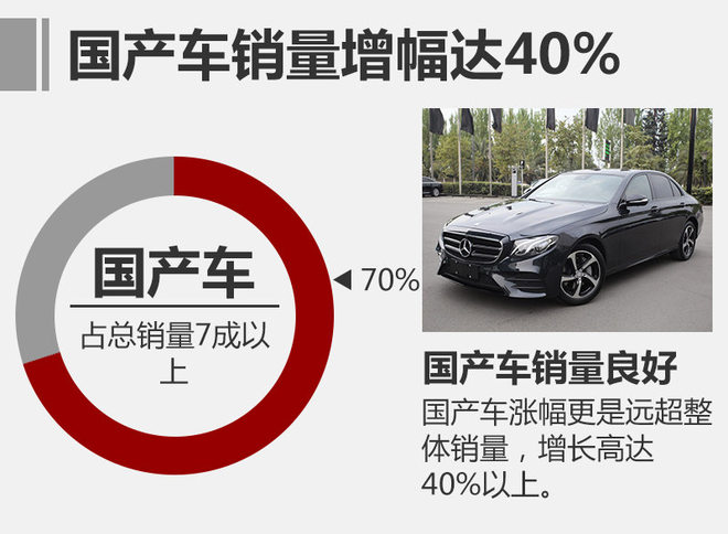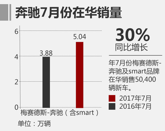 奔驰在今年上半年攻下中国豪华车市场桂冠后,销量继续保持高飞猛涨,涨幅更是远超其他地区。近日,网通社从梅赛德斯-奔驰官方了解到,今年7月份梅赛德斯-奔驰及smart品牌在华销售50,400辆新车,同比增长30%。其中国产车涨幅更是远超整体销量,增长高达40%以上。