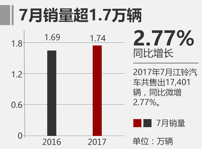 江铃汽车目前在SUV领域拥有福特撼路者、驭胜S330、驭胜S350三款车型,年内还将增加采用插电式混合动力的车型。网通社从江铃汽车官方获悉:江铃汽车1-7月总销量为17.12万辆,同比增长24.08%。其中驭胜品牌SUV今年前7月总销量为2.38万辆,同比劲增232.49%。