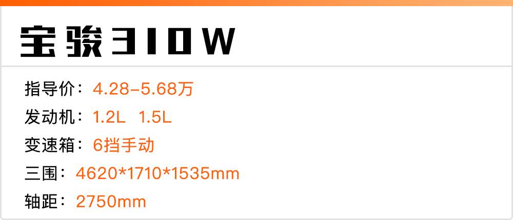 砖叔点评:宝骏310W可以说是国内卖的最便宜的旅行车了,起售价4.28万显得很有诚意。它的外形其实只能算是与旅行车接近,并不完全算是一台标准的旅行车,车身尺寸也不算大,只能属于旅行车中的紧凑型级别,不过在空间上还是值得肯定的,特别是后备箱空间,非常的实用。310W的动力也只能说够用,1.2L发动机能提供82匹马力,1.5L发动机则有112匹马力,城市代步通勤问题不大,但是想要一点激情的话就比较困难了,并且全系只提供6速手动变速箱,对于开惯自动挡车型的朋友们可能不那么友好,但考虑到它的售价,以及手动变速箱能带来较为出色的燃油经济性,这在某种程度上也可以算作优点了。