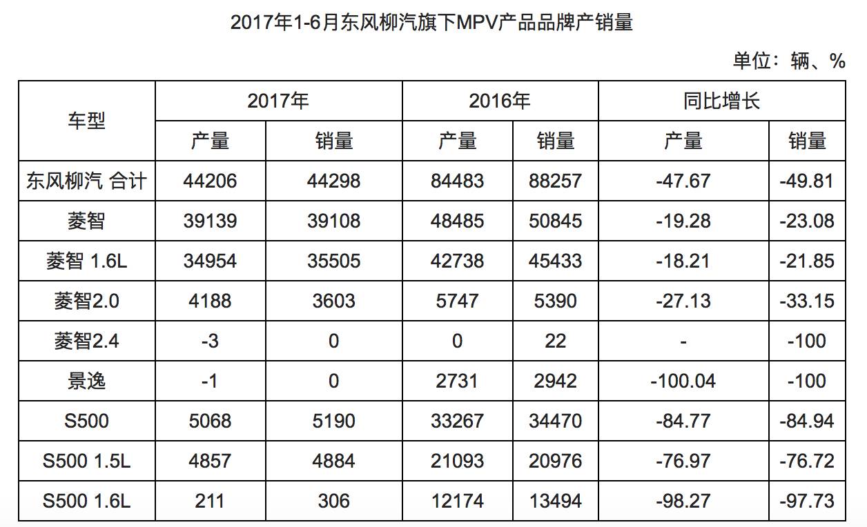 从去年同期13.49万辆跌至今年10.27万辆,柳汽的问题主要出现在MPV上。中国汽车工业协会数据显示: 2017年1-6月柳汽旗下MPV销量为44298辆,同比下降49.81%。看其车型销量细分会发现柳汽旗下每款MPV车型均有不同程度的下滑: