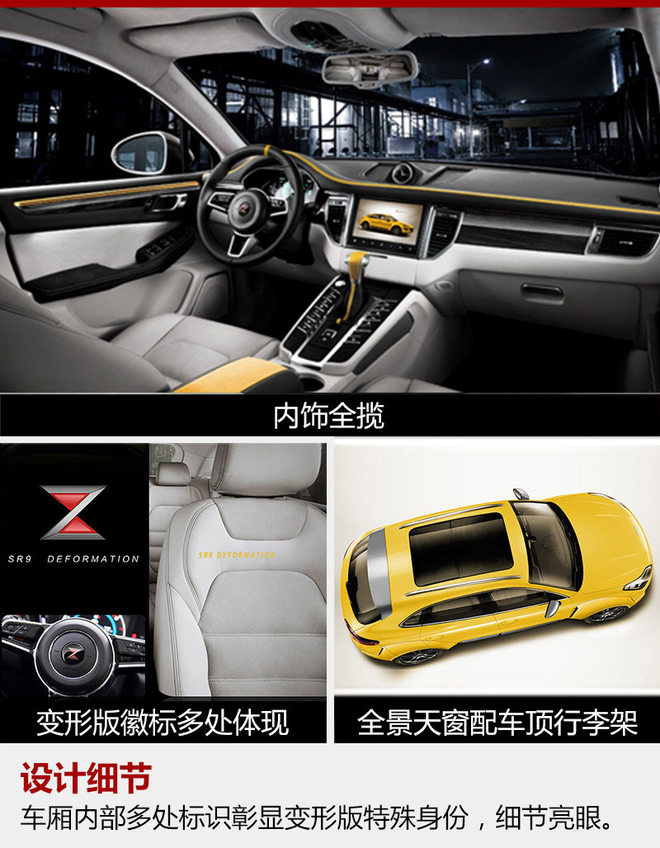 众泰SR9变形版外观设计充分借鉴《变形金刚》系列电影中的经典元素,整体造型激进,亮黄配色显眼。新车“鲨鱼式”前脸搭配梯形进气格栅,贯穿式腰线延伸至车尾,侧裙下围银色亮条装饰起到很好的点缀作用。车身前翼子板、轮毂盖、方向盘Logo均带有变形版标识,其徽标由众泰“Z”形车标演变,创意灵感借鉴符号“∞”。