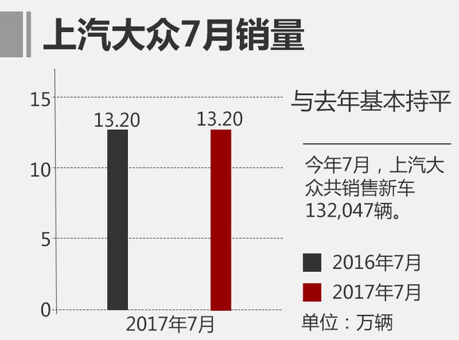 从公布的最新销量数据来看,上汽大众7月份单月销量达到132,047辆,与2016年同期的132,008辆相比基本持平;再看今年累计销量情况,今年1-7月上汽大众共销售新车1,102,069辆,相比去年的1,102,026辆,同样处于基本持平状态。