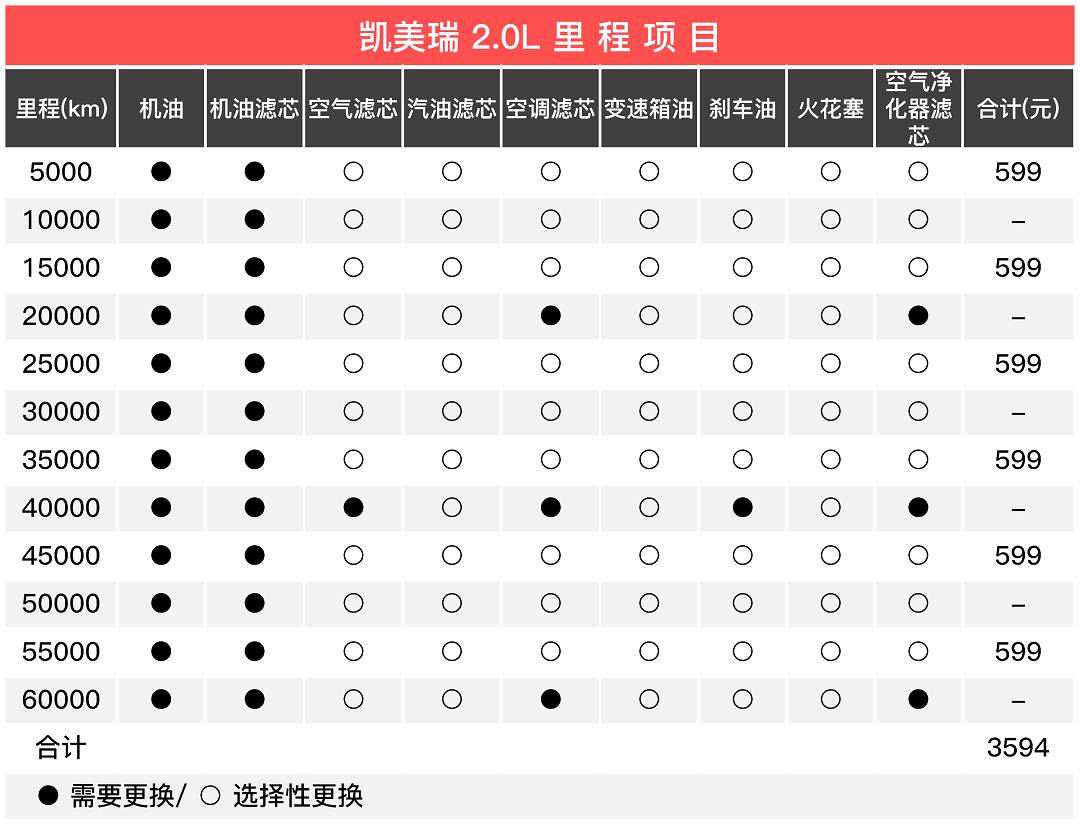 凯美瑞厂家送6次免费基础保养服务,包括空气净化器滤芯,官方建议一万公里一保养,所以三年之内6万公里的基础保养可以说是不用花什么钱了。表格中是按照4S店建议的5000公里一保计算,所以六万公里总花费三千六不到,相当实惠。