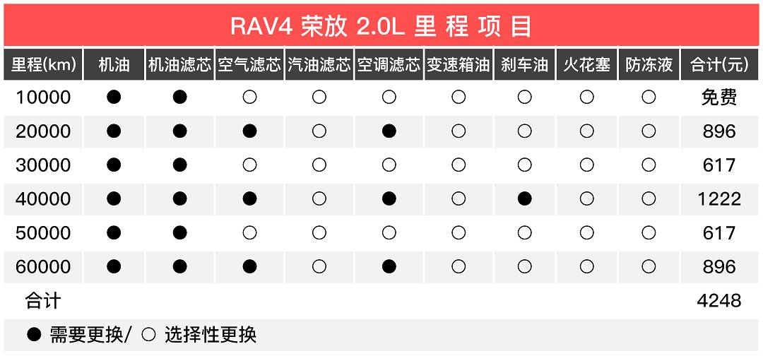 官方手册建议保养间隔是一万公里,但不同的是RAV4荣放只赠送一次的免费保养,那么六万公里下来总花费四千出头。