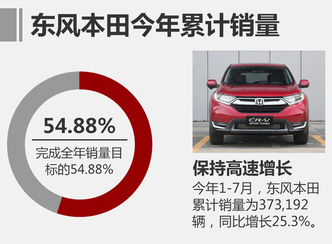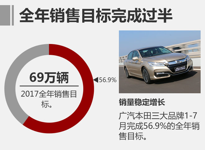 东风本田2017年调整后的销量目标为68万辆,前7个月累计销量373,192辆,同比增长25.3%,完成目标的54.9%。广汽本田今年的销量目标是三大品牌完成69万辆,截止7月份完成56.9%(含Acura品牌)。从完成目标成都来说,广汽本田要高于东风本田,距离目标更近。