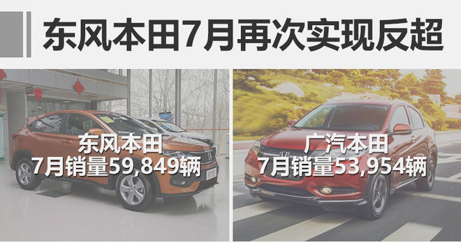 从7月份表现来看,东风本田单月销量59,849辆,同比增长18.2%;广汽本田销量52,954辆,同比增长5.1%。单从数据相比,东风本田销量超过广汽本田,增长率超过后者13.1个百分点。此外,今年5月份、6月份,东风本田也同样实现单月销量超过广汽本田。