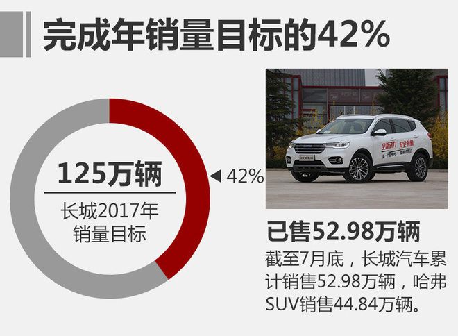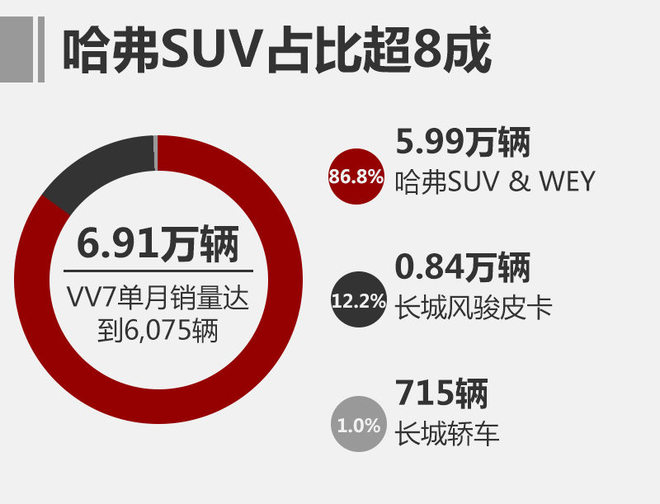 2017年7月,长城汽车旗下三大板块共售出新车6.91万辆,环比增长7%,其中SUV车型总销量为5.99万辆,占比高达86.8%;风骏皮卡总销量为8,420辆,占比约为12.2%;长城轿车6月销量仅为715辆。本年度长城汽车总销量达52.98万辆,已完成全年125万辆销售目标的42.4%。